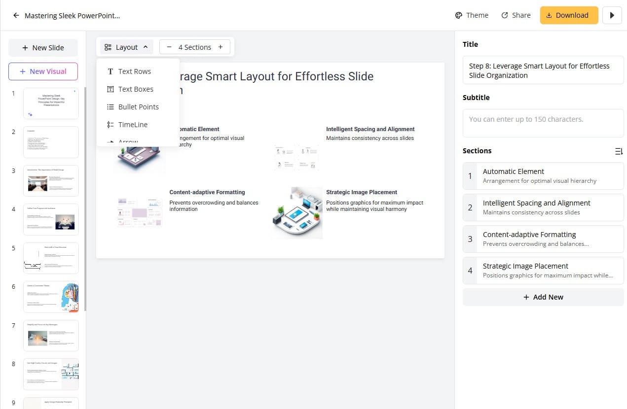 ✓Smart Layout Engine: Automatically arranges content for optimal visual impact and engagement