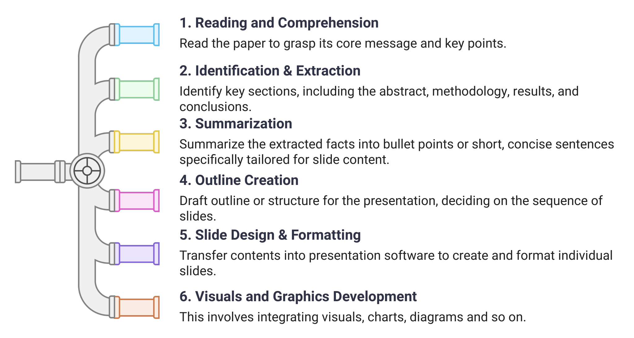 When converting a research paper into a presentation, the traditional manual process generally follows a structured sequence: