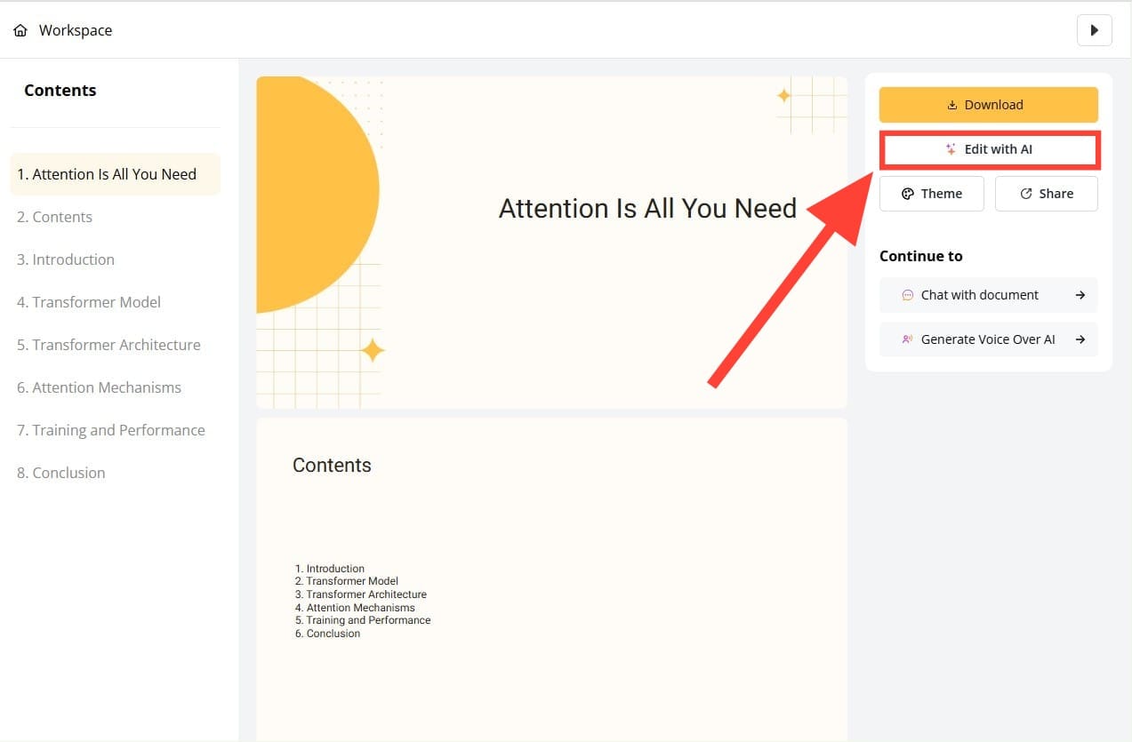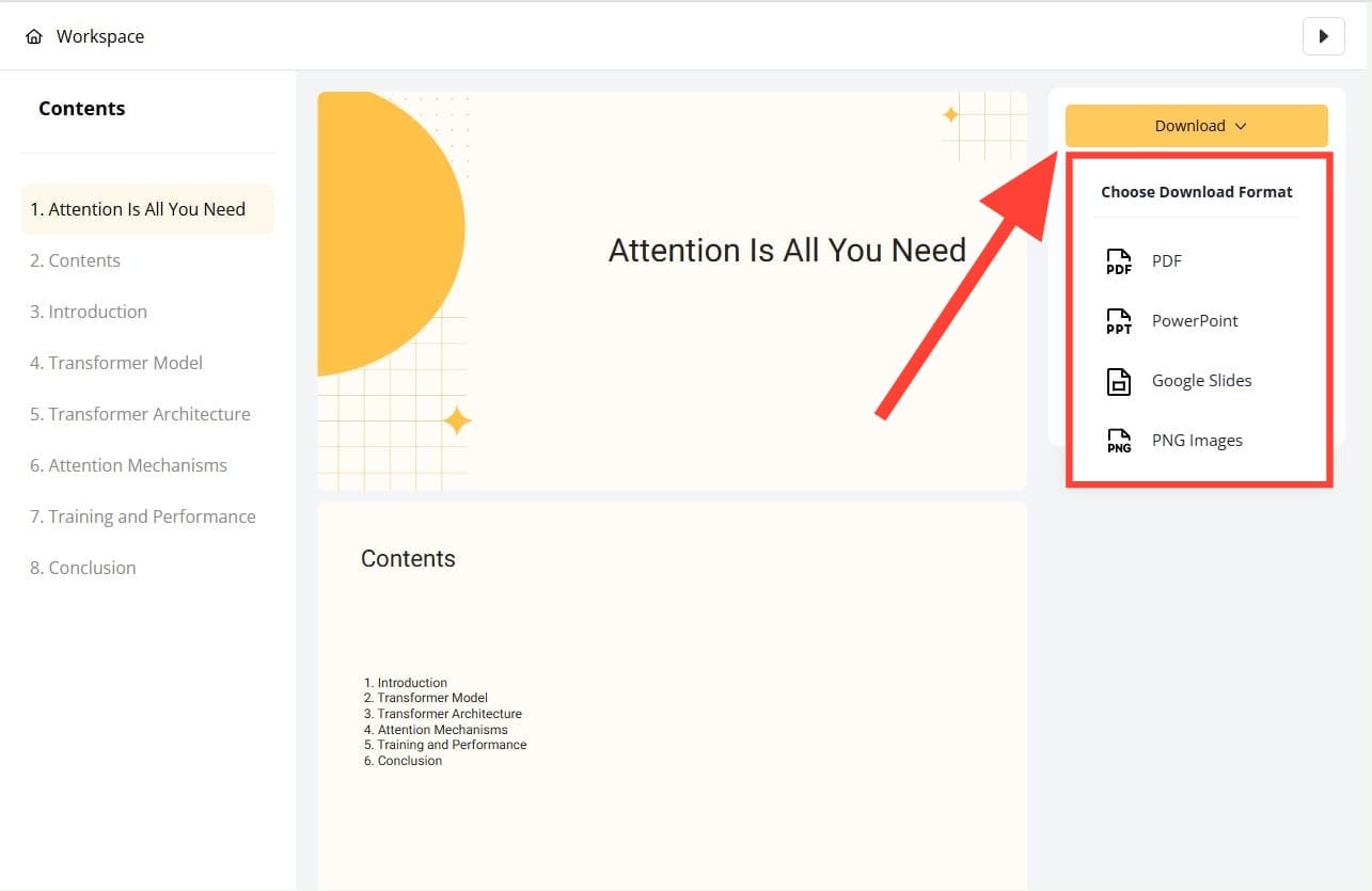 Step 3 - AI instantly converts your content into a well-structured presentation. You can choose to download this presentation directly as PowerPoint, Google Slides, PDF, or PNG. You can also click 'Edit with AI' for further editing of each slide.