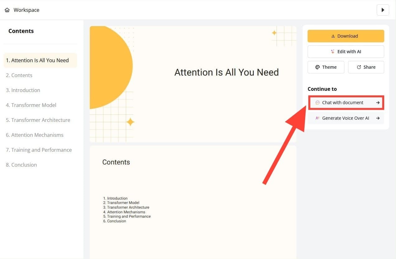 Simply click 'Chat with document'. You can ask AI to perform additional tasks, such as summarizing the document for you.