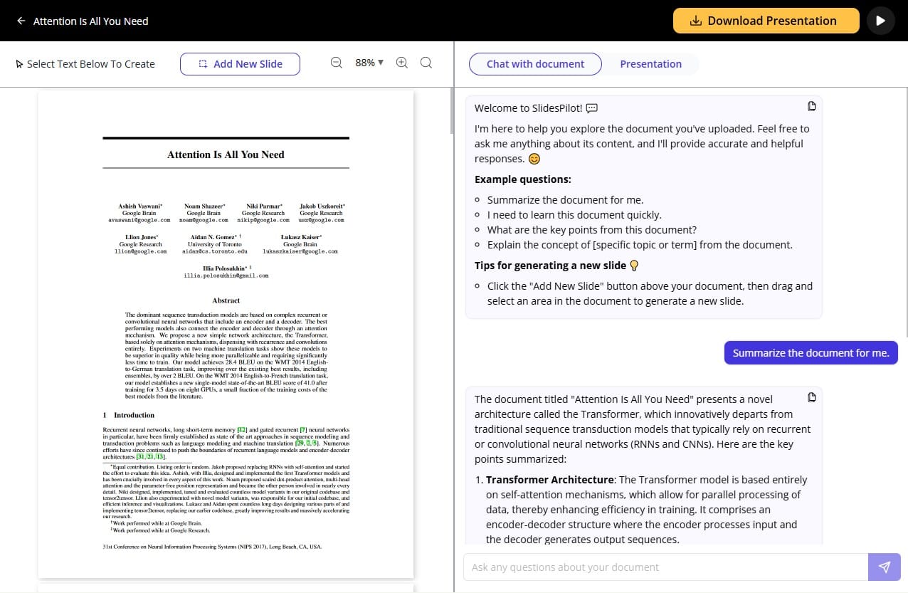 SlidesPilot’s 'Chat with document' is a powerful feature that acts like a personal research assistant, helping with time-consuming tasks. When you need a quick overview of a paper, it can instantly summarize the key points. You can also use it to explore specific sections or concepts in greater depth. This AI-powered function retrieves important content from papers quickly and accurately, saving time and effort compared to manual work while delivering better results.