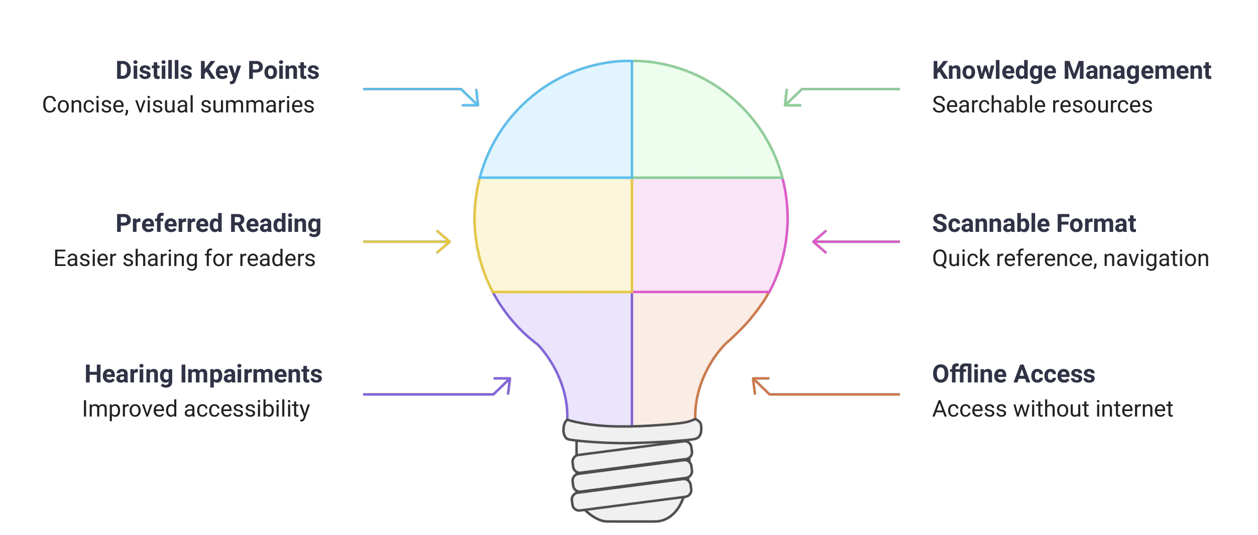 - AI-powered conversion maintains better content organization by identifying logical structure and key points.