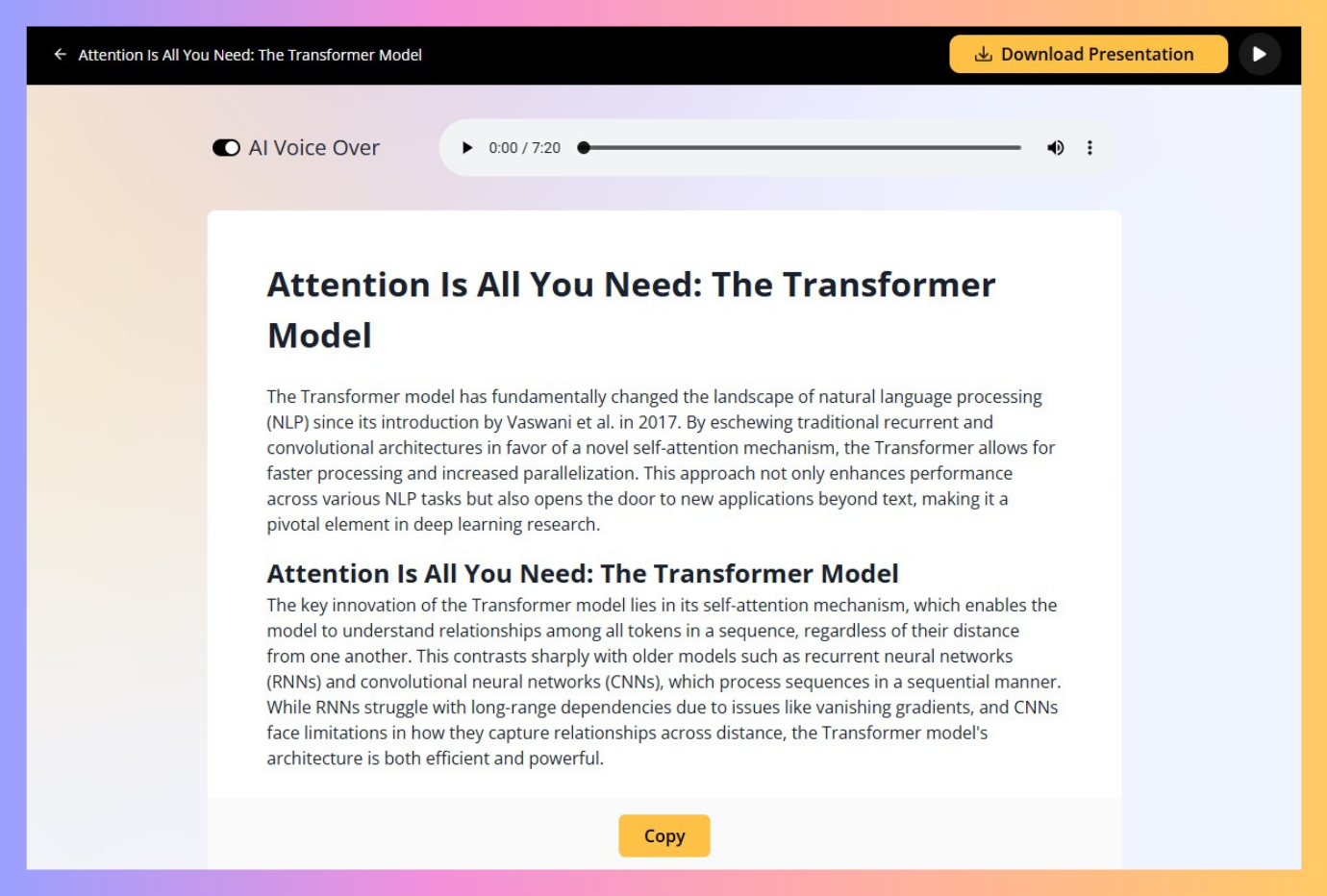 Ensure Consistent Quality: Ever notice how your voice starts to fade or change tone after speaking for a long time? AI voices maintain perfect consistency from the first slide to the last. No voice cracks, no fading energy, no sudden changes in volume or enthusiasm.