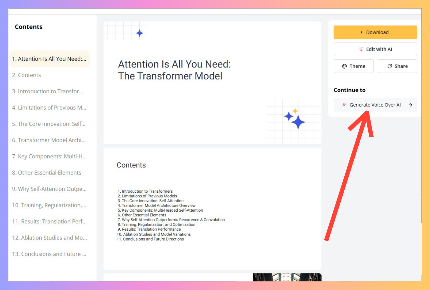 Practice Without Pressure: To get the most out of the AI voice over function, you can use it for rehearsal, allowing you to hear how your content flows before delivering it live. By listening to your presentation narrated professionally, you can identify weak transitions, confusing explanations, or pacing issues—giving you concrete feedback to improve your actual delivery without the stress. Listening to your content this way offers a critical preparation advantage that helps you refine your message before facing an audience.