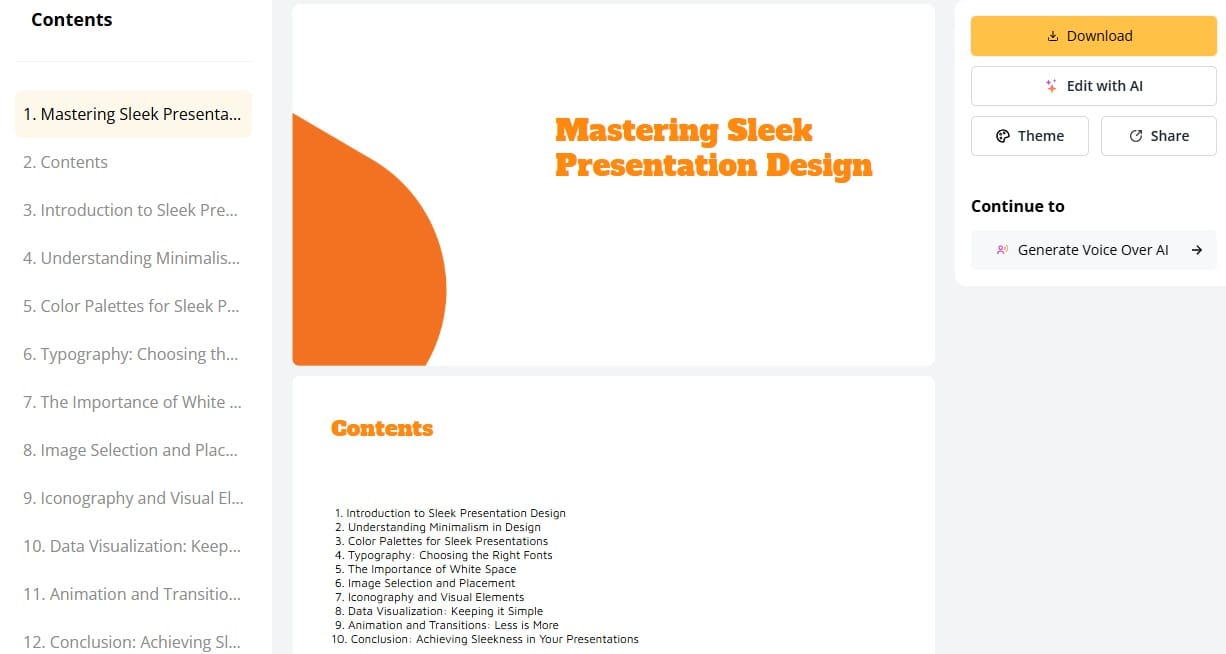 Pro tip: For presentation creation, specialized AI tools eliminate design decisions entirely—simply input your topic and key points, then refine the automatically generated slides rather than building from scratch.